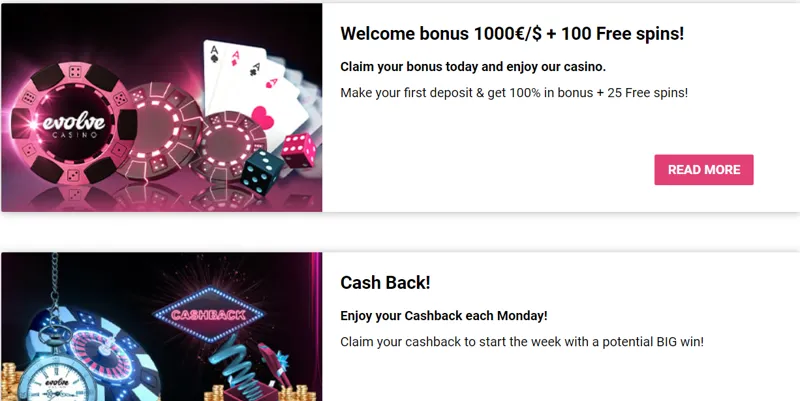 Evolve Casino erbjuder omsättningsfri Cashback till alla spelare. Minsta utbetalning är 1 euro och maximalt 1,400 euro per vecka. De har också en VIP-klubb med exklusiva förmåner som personlig manager, VIP-evenemang och prioriterad uttagshantering.