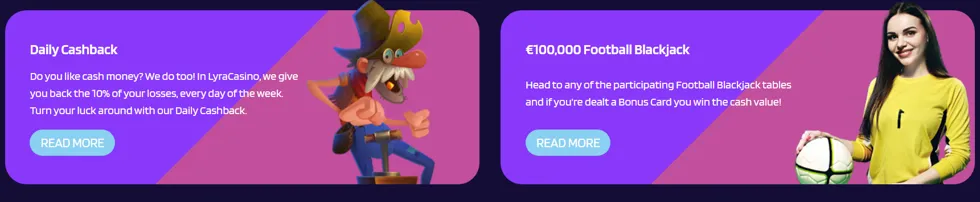 Cashback: Lyra Casino erbjuder daglig cashback på 10 % utan omsättningskrav. Cashbacken beräknas på förlorade insättningar mellan 06:00 och 05:59 CET och krediteras senast kl. 12:00 CET nästa dag. Cashbacken avrundas till närmaste euro och krediteras endast till aktiva konton.