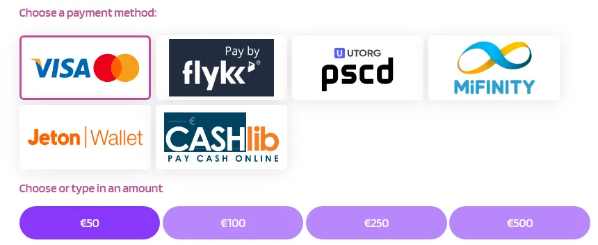 Du kan använda VISA, Mastercard, Jeton Wallet, kryptovalutor, MiFinity, eZeeWallet, AstroPay och SEPA-banköverföringar. Varje metod har sina egna insättnings- och uttagsgränser, och SEPA-banköverföringar är endast tillgängliga för uttag.